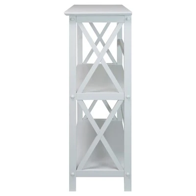 Storage with ease, this Montego X-Design Style Bookcase is constructed with solid wood for lasting use. 3 shelves provide ample storage space. A thorough finish gives this bookcase a strong, contemporary appearance. Perfect for home storage and decor. Light and easy assembly. Wall mount hardware provided. Product dim: 29.5″W x 11.75″D x 34″H. Weight capacity: 25lbs per shelf.