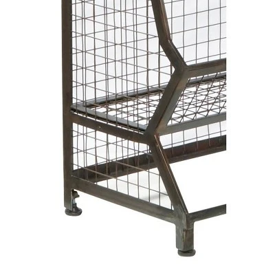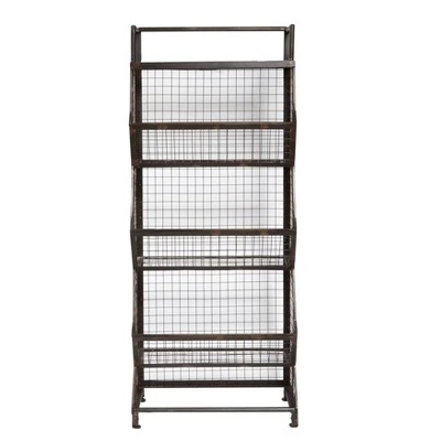 Clever and unique, the iron Clendon bin étagère works perfectly as a storage piece for kitchen, den, entry, mudroom, teenager’s room, practically anywhere. It can hold potatoes, schoolwork, gloves or whatever you want to toss in and easily access later. Even empty, the iron shelving unit with rustic finish adds interest to a room. Bins are stationary.