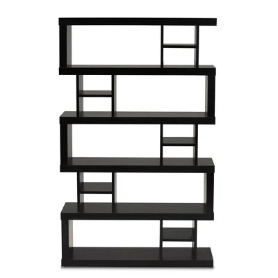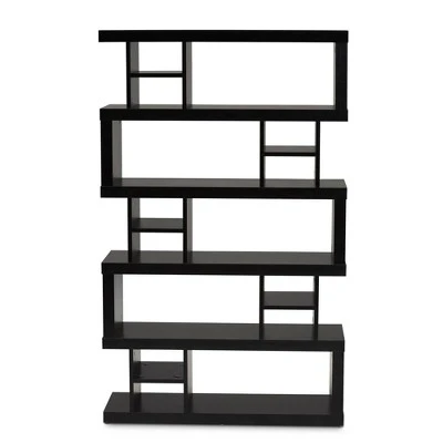 Add visual interest to your living room or office with the Dora bookshelf. This wooden bookshelf showcases a sleek dark brown finish that is easy to coordinate with any color palette. Four staggered tiers create a visually striking display for all your favorite books and knick-knacks. Its narrow profile makes it well suited for smaller spaces. The Dora bookshelf is made in Malaysia and requires assembly. Dimensions: 57.01″ high x 35.04″ wide x 11.34″ deep; Small shelf: 11.67″ high x 22.67″ wide x 10.82″ deep; Large shelf: 9.37″ high x 20.9″ wide x 11.33″ deep;