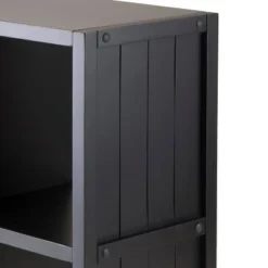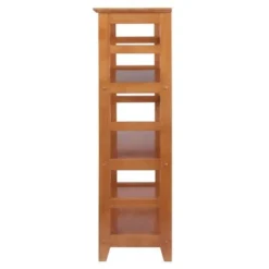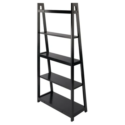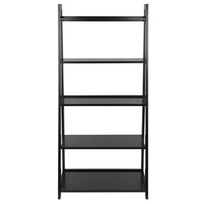 Enhance your room decor with an urban, industrial appeal with the Adam A-Frame Shelf from Winsome. with five tiers supported on a ladder-like silhouette, this decorative frame shelf brings a fresh look to your interiors, while the black finish lends a sophisticated touch to any setting. Perfect for displaying your prized book collection, this five-tier shelf provides ample space for filling it with framed photographs, decorative pieces or figurines. There are 5 total shelves of differing sizes. Overall shelf size is 27.8″W x 12.9″D x 58″H. Combine this with the Adam Desk and Corner Shelf to create a complete look. All five shelves are 26.3″W. 1st Top Shelf depth is 4.1″D, 2nd Top 6.”D, Middle 7.9″D, 4th Shelf 9.75″D and 5th Bottom Shelf 11.6″. There is a 12″ Clearance between each shelf. Made with combination of solid and composite wood in black finish. Assembly required.