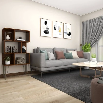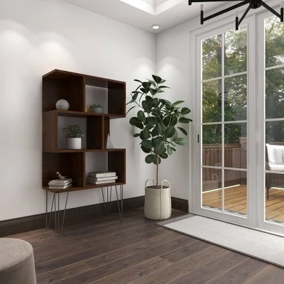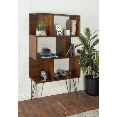 - This wood and metal storage unit features brown wooden shelf with silver hairpin legs