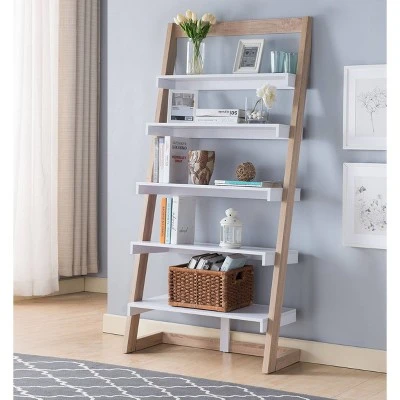Get ahead of the interior trends with this ladder bookcase. The design holds five white shelves that stylishly presents books, pictures and other decors in a teen bedroom or dorm room. An angular frame leans casually against a wall for a sophisticated look that pulls a room together in style.