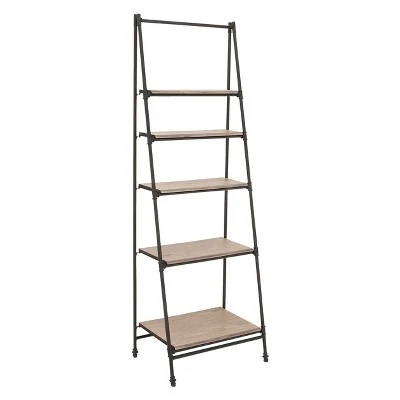 This industrial 5-tier ladder shelf provides you a perfect storage solution and offers a clean and comfortable living space. Filled with shoes, books, blankets and more, these shelving units are a stylish way to store your stuff. Utilize your wall space to additional storage any where in your home. This item comes shipped in one carton. Suitable for indoor use only. An accent furniture with 5 shelves in varying sizes. Industrial theme. Maximum weight limit for shelf is 30 lbs.