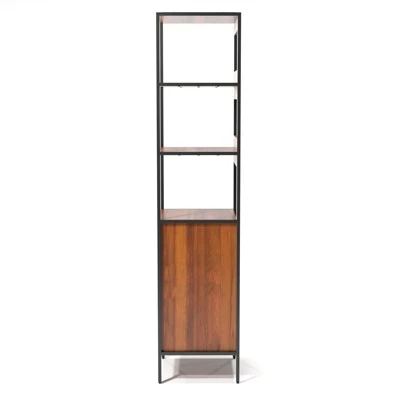Bookcases aren’t just for holding the books. Though they make ideal homes for your teens paperbacks, they’re also perfect for staging framed family or friend photos, keeping baskets filled with accessories, and putting your potted plants on display. Take this one for example: Crafted from manufactured wood in natural finish and black metal, its openwork frame features a clean-lined silhouette while bottom compartment offers extra storage needs.Features : Includes: One (1) BookcaseStyle: ModernFinish: Natural ToneMaterials: MDF, Acacia Veneer, SteelSlim, tall design for compact spacesClosed cabinet in the baseThree open shelves and bottom cabinet with door accessTower design conserves spaceCombines open display with concealed storageMinimalist silhouette with an inviting two tone finishEasy to follow step by step assembly guide includedSpecifications : Product Dimensions : 17″W x 16″D x 72″HProduct Weight : 72 lbsWeight Capacity : 80 lbsAssembly Required : YesWarranty Description : 90-Day Manufacture Limited Replacement Parts Warranty