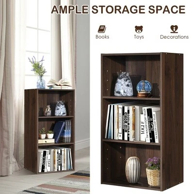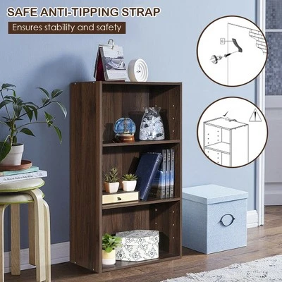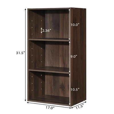 Do you need extra storage to organize you room? It’s time to use our practical and simple 3-tier storage shelf. Constructed of thickened MDF with premium durability, it has a very long service life. The floor-standing structure provides better stability, which giving you a safer using experience. The smooth and wear-resistant surface is very easy to clean and maintain. Most importantly, the 3-tier storage design can help you make the most of your limited space and provide ample storage and display space for your books, toys, potted plants and decorations. Adjustable shelves and multifunctional design can meet your various storage needs. Featuring clean lines and modern style, this beautiful and practical furniture is the perfect addition to your bedroom, living room and office. Specification: Color: Walnut. Material: MDF. Dimension: 17” x 11.5” x 31.5” (L x W x H). Net Weight: 38 lbs. Weight Capacity: 150 lbs. Package includes:. 2 x 3-Tier storage shelf. 1 x Instruction.