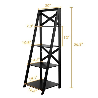 This is our 4-tier bookshelf, which is perfect to fit your bedroom, living room, home office or the kids room. Its unique leaning ladder space-saving tiered design adds stylish storage to your living space. Four graduated shelves make maximum use of your floor space. Featuring solid wood structure, it is durable and sturdy. This bookshelf will meet your widely need whether you read novels, sci fi, political thrillers or you need more room for the kids books. Do not hesitate to buy it now! Specification: Color:Black. Main Material:MDF. Overall dimension:20.0” x18.1” x 56.3”(L x W x H). Package includes:1 x Bookshelf;1 x Instruction. . .