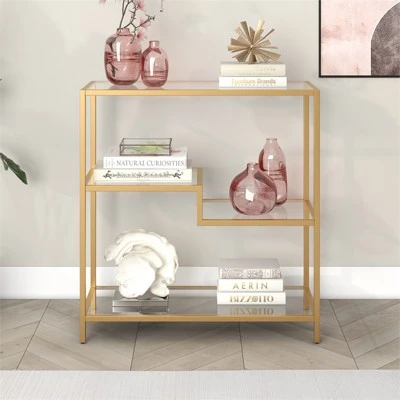 Designed to blend perfectly with your existing modern décor, this sturdy bookcase stands at 36″ tall. Its compact footprint makes this the perfect storage space if you’re working with a tight corner or smaller home office space. The geometric, staggered shelving is made of durable tempered glass, creating plenty of storage without weighing down the room visually. The four tiers allow you optimal space to display your books, pictures frames, plants and more!Features : Compact size is perfect for small spacesTabletop and shelving are made of durable tempered glassHandcrafted finish is applied to the steel frameTop and bottom shelves have a weight capacity of 30 lbs; middle shelves can support 20 lbs.Features easy assembly.Clean with a soft, dry cloth; no harsh chemicals or abrasive cleaning materials.Specifications : Product Dimensions : 34W x 14D x 36HProduct Weight : 39.9 lbs