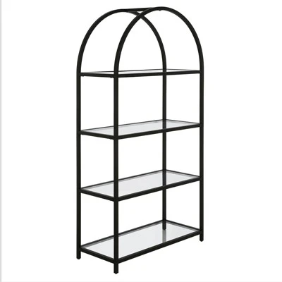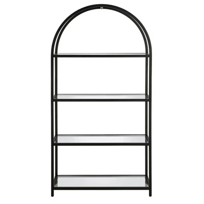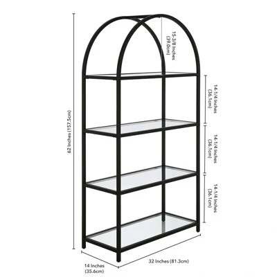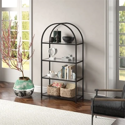 Showcase your favorite books and decorative items with this Art Deco-inspired 4-tiered bookcase. Clean architectural lines evoke a modern look, while the arched frame adds a pop of retro styling. Crafted of steel and sturdy tempered glass, its finished in a classic neutral metallic tone, allowing it to pair effortlessly with your existing den or home office décor.Features : Handcrafted finish applied to a steel frameCrafted of durable steel and tempered glass.Tip restraint hardware included.Features easy assembly.Clean with a soft, dry cloth; no harsh chemicals or abrasive cleaning materials.Specifications : Product Dimensions : 8H x 37.5W x 36.5DProduct Weight : 52.7 lbs