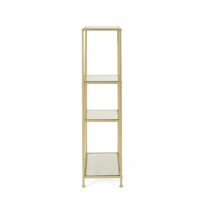 MODERN GLAM: Our bookcase showcases a dazzling gold finish and clear tempered glass shelves seamlessly for a luxurious modern glam look. Complemented with asymmetrical shelving and a minimalistic structure, this bookcase brings a sleek touch to any decor.