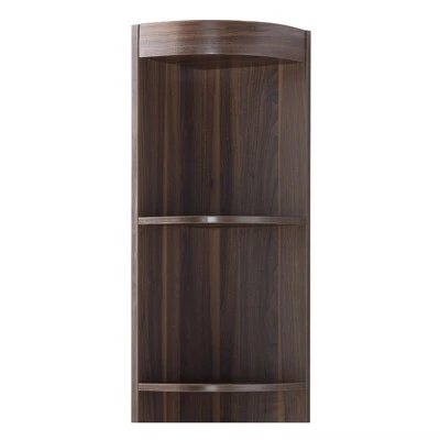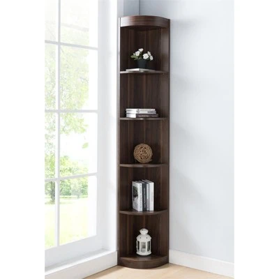 Add functionality to unused corner space with the Maleena 5-Shelf Corner Bookcase. Evenly spaced shelves are smooth and rounded providing additional storage space for decor, books, and more. Crafted from MDF, Veneer, and solid Wood for durability and a lasting product, it provides a steady and solid foundation to fit your needs. Try placing this dark walnut finished furniture piece next to a contrasting colored background for a cheery pop of color.Features : Includes: One (1) Corner BookcaseStyle: ContemporaryFinish: Dark WalnutMaterials: MDF, Wood VeneerSmooth rounded bodySpacious open shelvesFlat rounded baseSpace-efficient corner designEasy to follow step by step assembly guide includedSpecifications : Product Dimensions : 12″W x 12″D x 77″HProduct Weight : 49 lbsWeight Capacity : 40 lbsAssembly Required : YesWarranty Description : 90-Day Manufacture Limited Replacement Parts Warranty