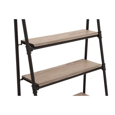 A decorative home storage item that works best with an industrial style-home. Filled with shoes, books, blankets and more, these shelving units are a stylish way to store your stuff. Utilize your wall space to additional storage any where in your home. This item comes shipped in one carton. Suitable for indoor use only. This beige and black ladder style shelf can support up to 100 lbs. An accent furniture with 4 shelves in varying sizes. Industrial theme