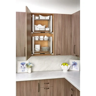 Reach the top shelf with ease thanks to Rev-A-Shelf Convenient Wall Cabinet Pull-Down Shelf System. Bring hard-to-reach items down to you with this convenient 2-tier cabinet pull-down system. This functional pullout features a unique gas assisted lifting/lowering mechanism that provides unparalleled stability through the entire range of motion. The shelving system locks in the down position so you can reach everything in your wall cabinet hands-free. Support up to 17 pounds of your favorite snacks, extra linens, supplies, and more in this helpful organizer. This package includes 1 pull-down shelving system and mounting hardware for easy installation.