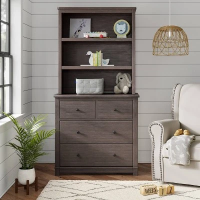 Infuse your nursery with the farmhouse-style Monterey Bookcase/Hutch from Simmons Kids Slumbertime. This versatile piece features two shelves (one permanent, one removable) to display your baby’s books, keepsakes, and more. Its convertible design allows you to use it as a bookcase with the provided base, or as a hutch placed on top of the coordinating Monterey 4 Drawer Dresser (sold separately). Due to varying wood grains and variations in the hand-applied finish, product might appear slightly different than those shown on site. Producing the finest furniture for over 80 years, Simmons Kids has always been committed to the safety of every family. All Simmons Kids nursery furniture is rigorously tested to meet or exceed all industry safety standards.